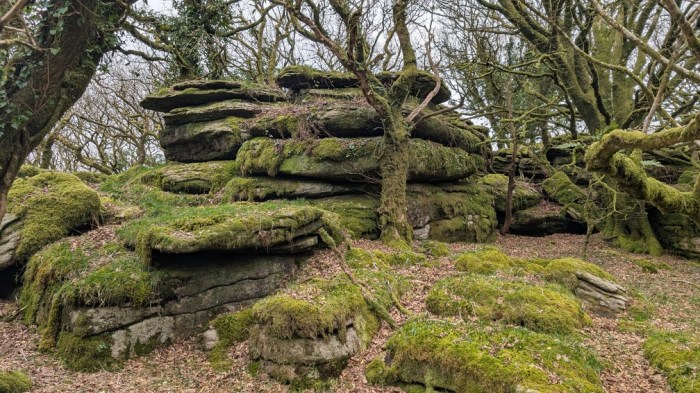 A brief break while weighing up making a beeline for the road, or a more interesting route, and I set off again, making for Hucken Tor on the edge of the woods above the River Walkham. I’m not usually one for tors in woodland, but Hucken is undeniably impressive.
