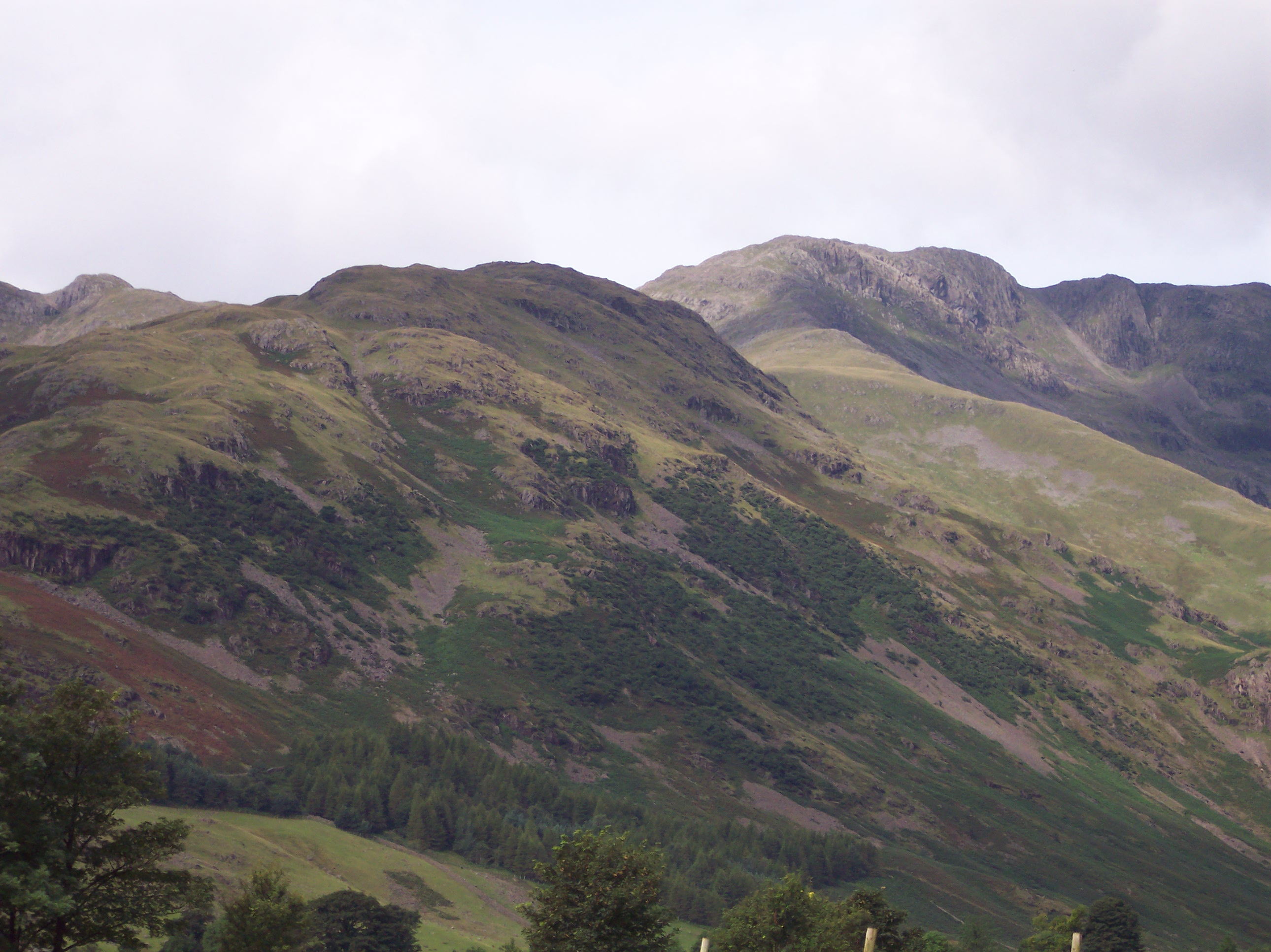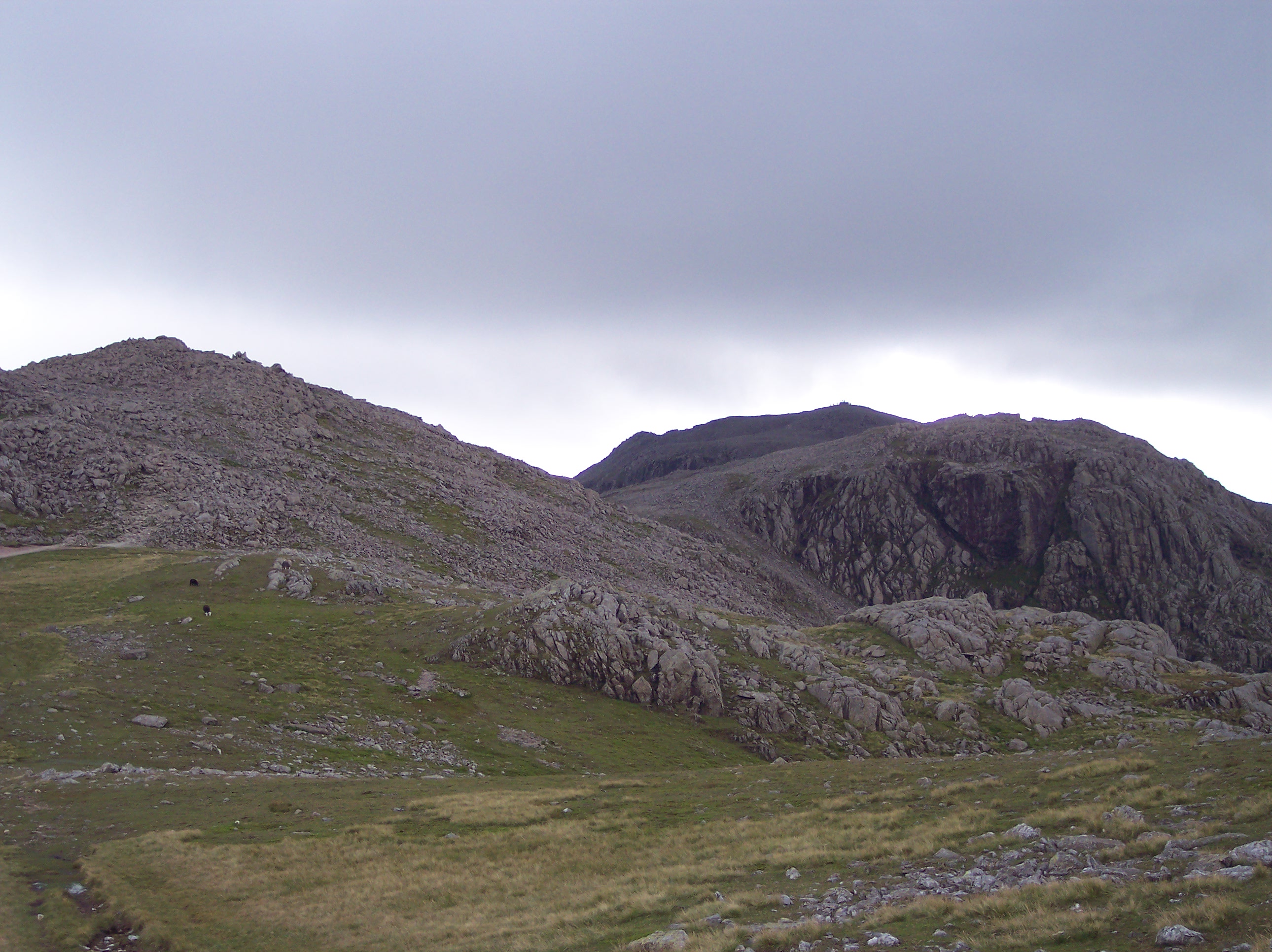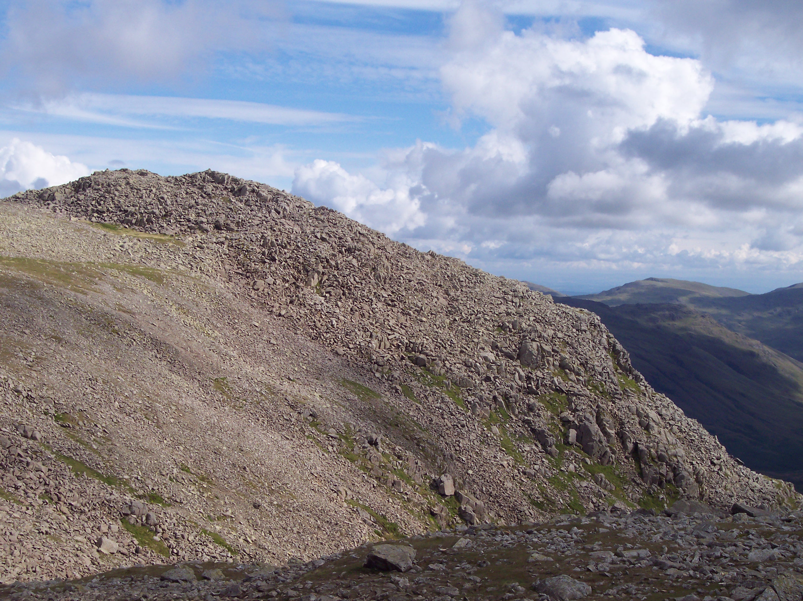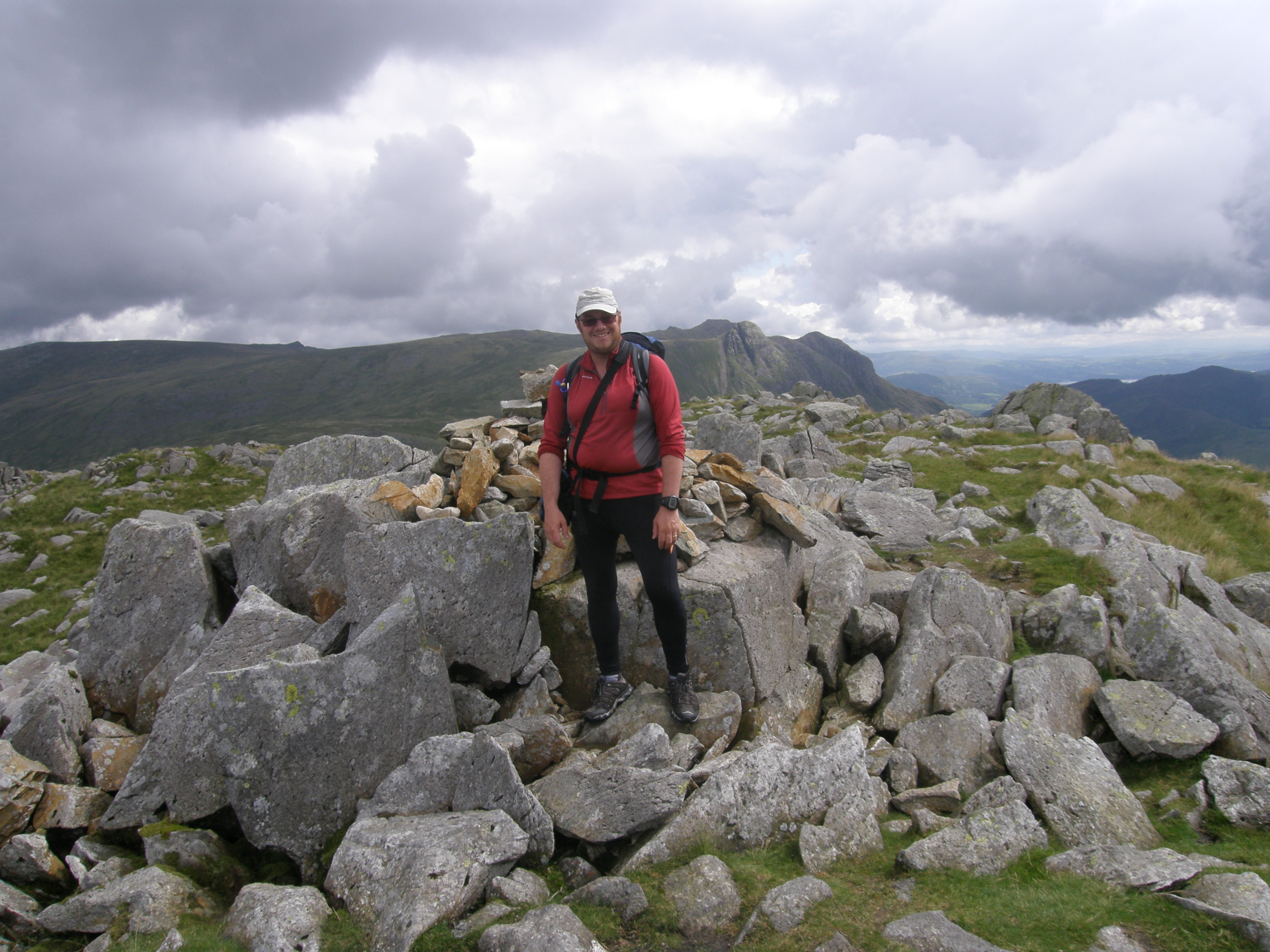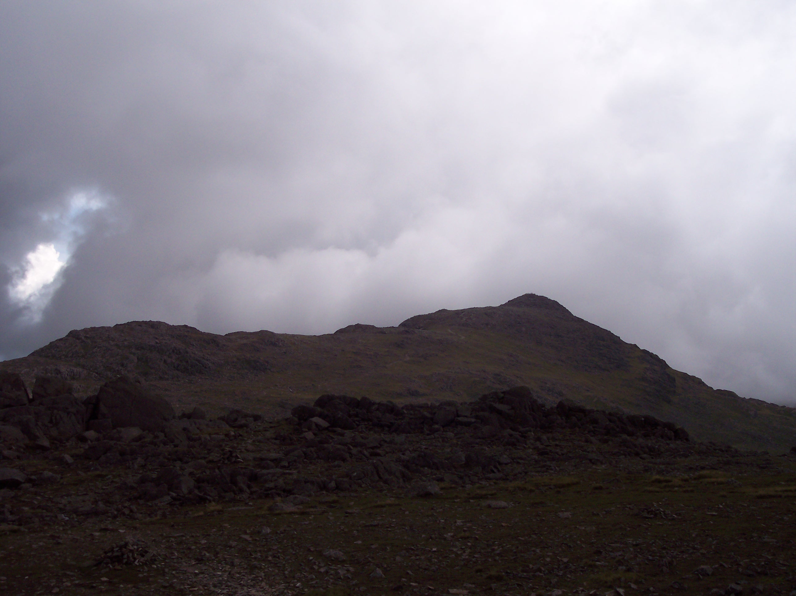 Two months before this walk in June 2007, because of a really early start I’d had a good long walk over Pike o’Blisco, Cold Pike and Crinkle Crags, but flagged in the afternoon and couldn’t manage Bowfell and Esk Pike as well. So I returned to my tent in Langdale. Camping with the family in August 2007, I had another go, and this time deliberately kept my plan modest so that I could flex it as I wanted. Rather than simply return to Three Tarns, form where I’d descended two months before, I decided to take a look at the Great Slab route. It was hard going but the adrenalin buzz took me to the summit for an early lunch. Feeling energised and as the mist cleared, I continued the walk as planned along to Esk Pike and saw Great End ahead with a lovely patch of blue sky above. Having made good time and not wanting the day to end, I decided to carry on rather than descend, and duly picked off Great End, Ill Crag and Broad Crag on my way to Scafell Pike. Having not had time to linger on Scafell Pike the previous time I’d been (I was on a timed challenge walk), I took in the panorama at my leisure. But it was late in the day, and I still had a long walk ahead of me, back down to Esk Hause and Langdale. So late in the day, that the wild campers were already setting up beside Angle Tarn. I arrived back at the tent to be told off for being late, but I’d completed the hardest and most fulfilling walk I’d ever had in the Lake District up to that point.