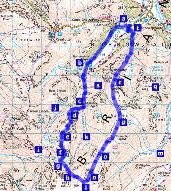 Note: the alternative return route via Styhead Gill will bring you back to Stockley Bridge (c) where you simply reverse the first part of the walk back to Seathwaite Farm or Seatoller. The alternative route via Ruddy Gill (h) and Grains Gill (k) takes you straight back to the farm, also via Stockley Bridge. The alternative route via Langstrath (m) will bring you out at Stonethwaite, where you will have to walk back along the road to the car – or simply catch the bus from Stonethwaite.
