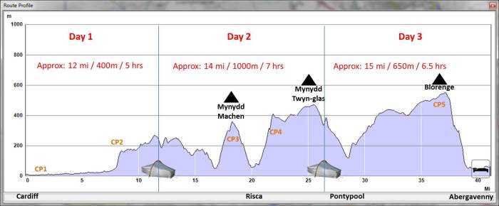 It seems no one spotted the "deliberate" mistake in my last planning post - indeed I was even complimented on the reasonableness of my 24 day schedule. Except, if you'd added up the days for each section you'd have come up with 27, making it even more reasonable. It was only sitting down to start … Continue reading Planning the Cambrian Way – Part 3: Cardiff to Abergavenny (Stage 1)