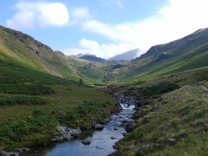 I was halfway down a suspiciously unlimey lime and lemonade, when a large blue rucksack came bobbing along the lane in front of the pub. It turned into the "beer garden" and Cath emerged from underneath it, and muttered some words I took to be a greeting. A few minutes later with a pint of … Continue reading The Four Valleys Walk – Part 2: Eskdale, Wasdale & Borrowdale