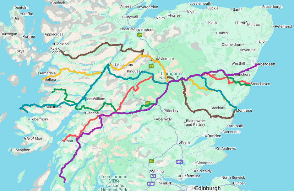 The horrors of Loch Beoraid, the Corran ferry and West Highland Way to Kinlochleven, then straight across to Blair Atholl, Glen Tilt, Deeside Way and Feterresso Forest.